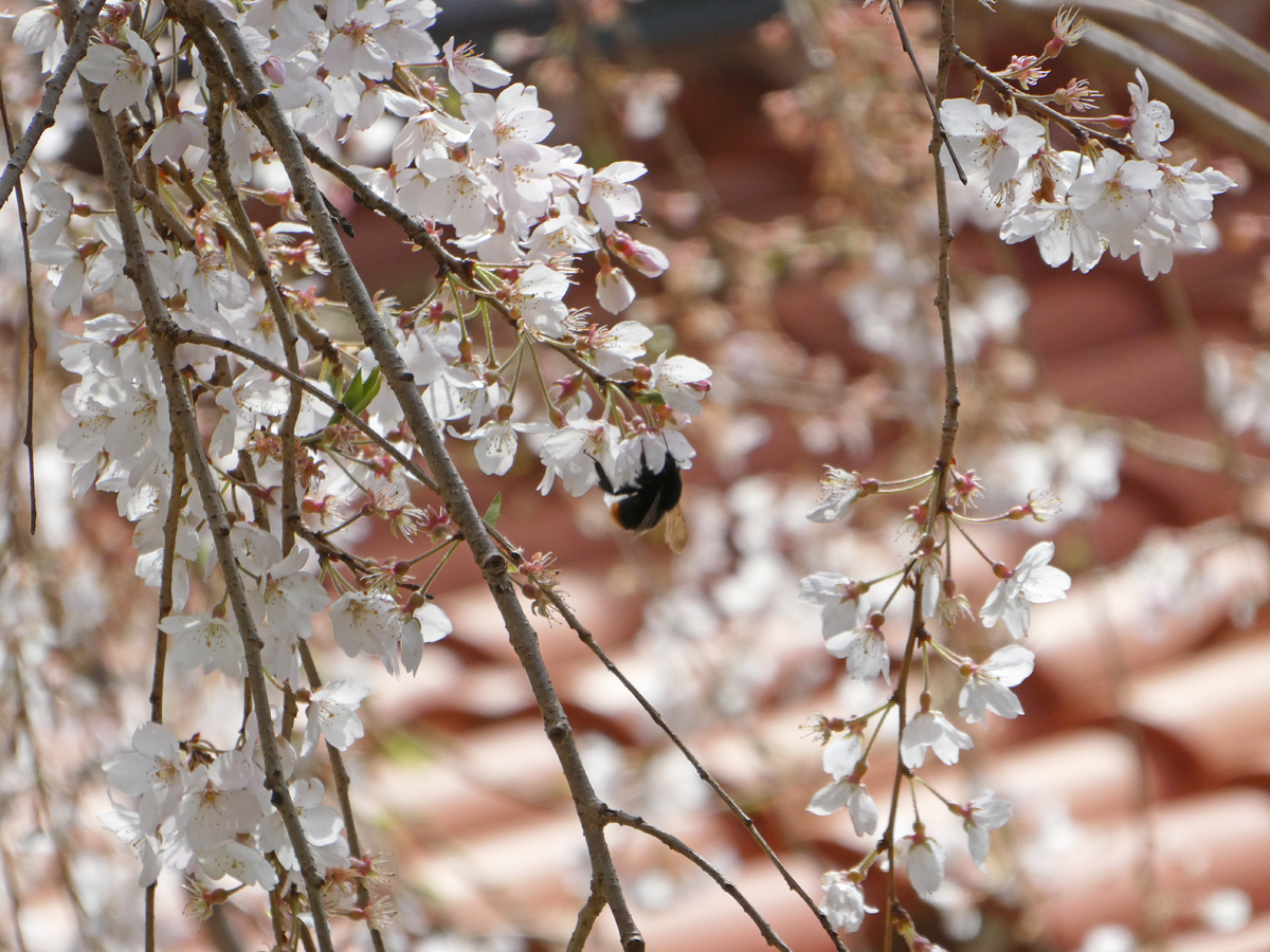 昨日の強風により、ずいぶんと花を散らした中庭のしだれ桜。