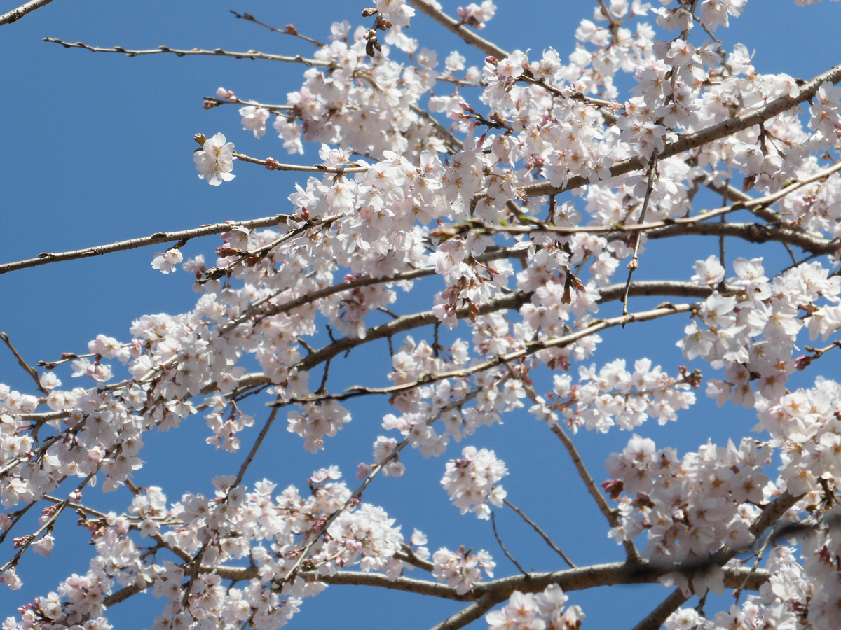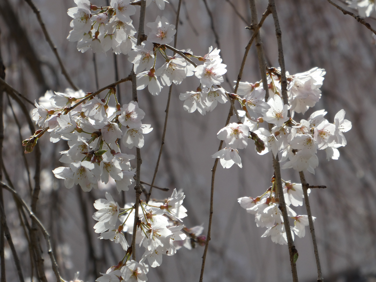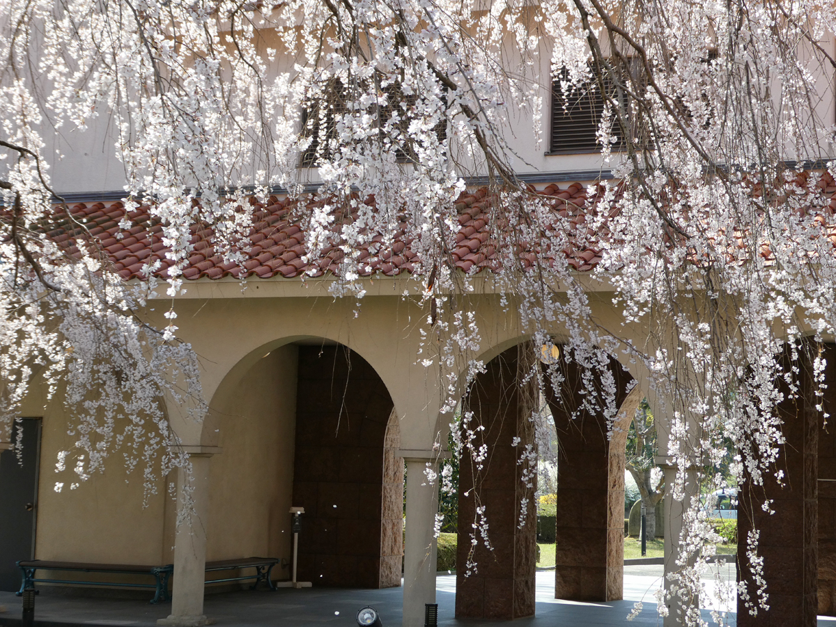 見頃が続く中庭のしだれ桜は、少しずつ花びらを散らしています。